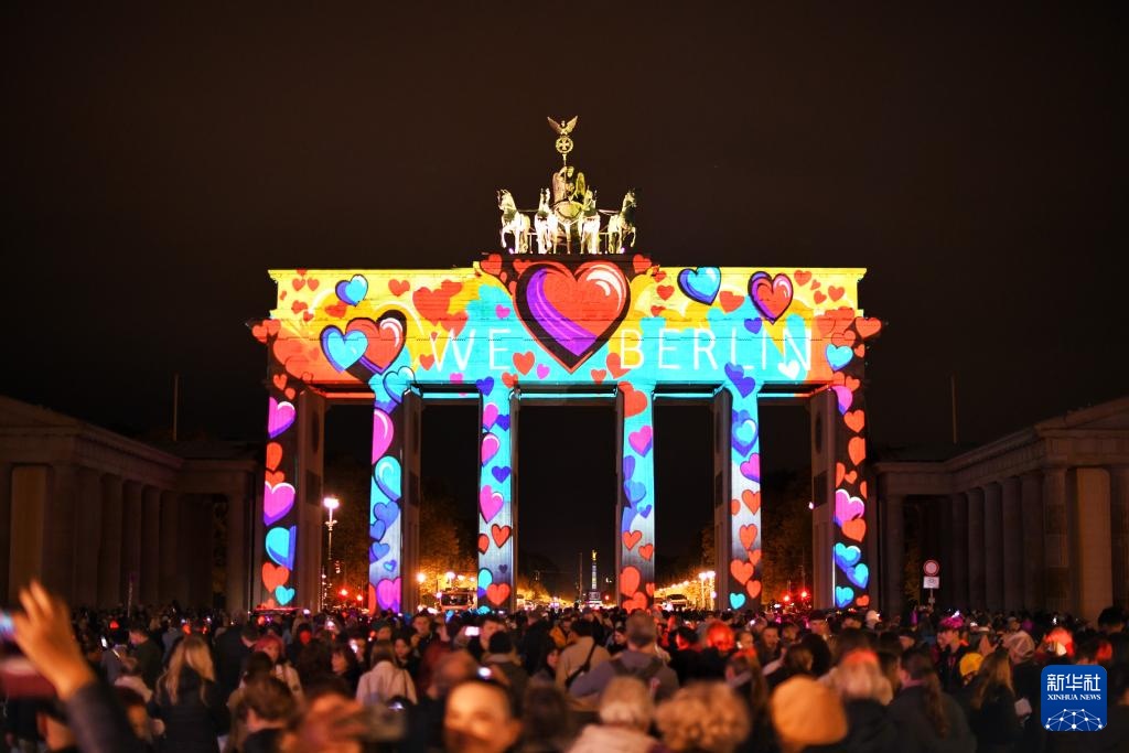 10月9日,德国柏林勃兰登堡门亮灯。